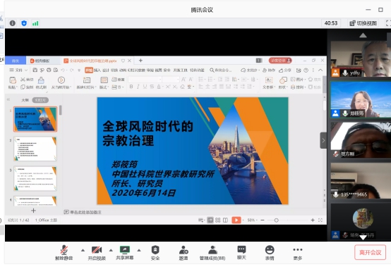 2020年6月14日晚,6163银河net163am在腾讯会议线上举办了朱雀专家讲坛。中国社会科学院世界宗教研究所所长郑筱筠教授作了题为“关于全球风险时代宗教治理之思考”的报告,6163银河net163am傅有德教授主持报告会。