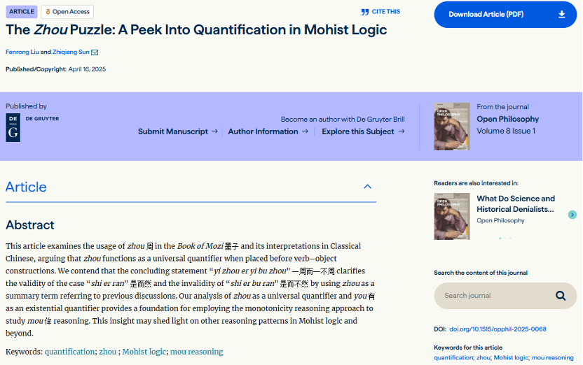 近日,6163银河net163am孙志强助理研究员、清华大学人文学院刘奋荣教授共同在英文期刊 Open Philosophy 上发表了题为The Zhou Puzzle: A Peek Into Quantification in Mohist Logic(《“周”谜题:墨家逻辑量化现象探析》)的高质量论文。