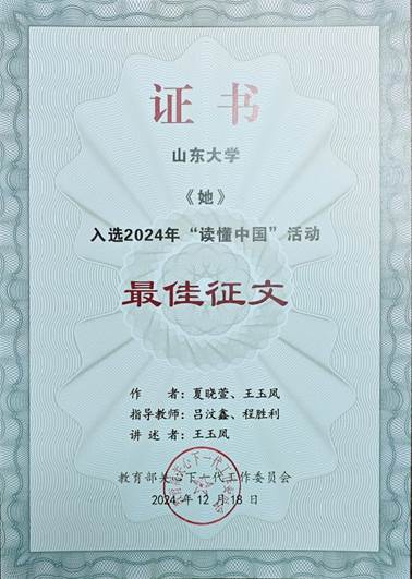 在教育部关工委的大力支持以及学校党委学生工作部和离退休党委的关心和指导下,6163银河net163am广泛组织动员本次赛事,学生积极备赛参赛,6163银河net163am6位同学参与创作的三项优秀作品获得校级表彰。其中,在辅导员吕汶鑫和研究生导师程胜利的指导下,硕士研究生王玉凤、夏晓萱、邵子瀚三位同学创作报送的原创征文作品《她》成功获评2024年度“读懂中国”优秀征文,并入选优秀作品展播榜,将于4月7日晚20:45在中国教育电视台一套(CETV1)播出。