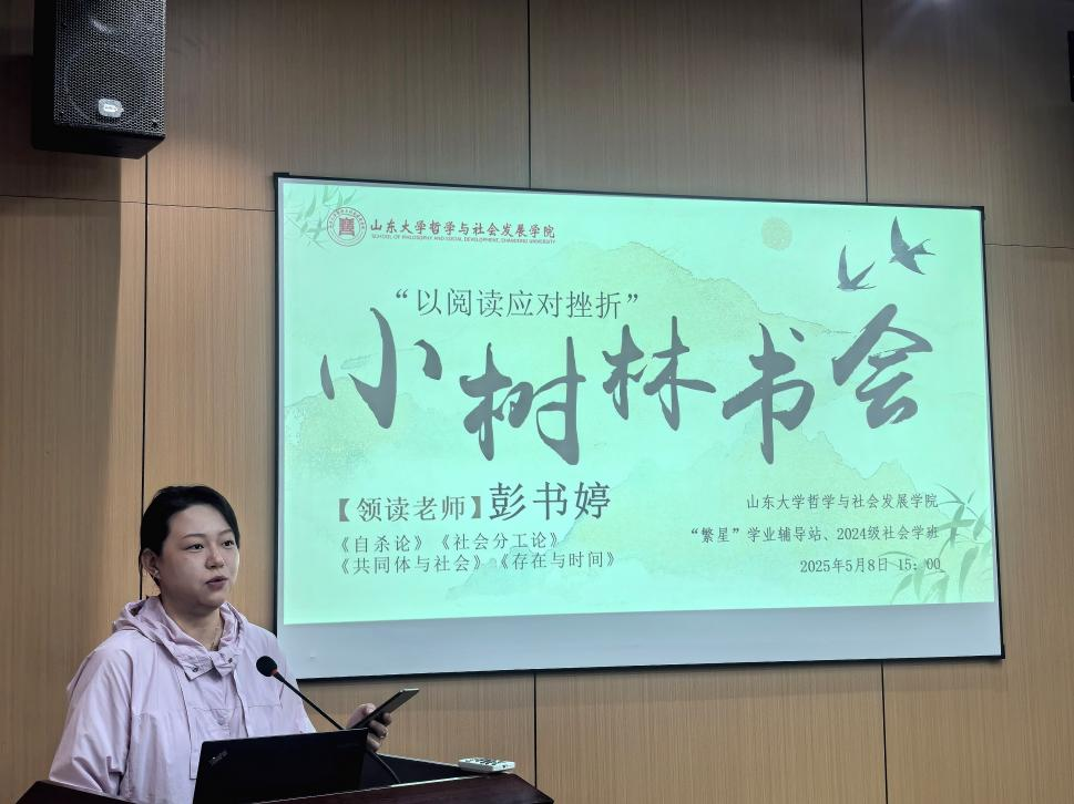 为深入学习贯彻习近平总书记关于全民阅读的重要指示精神,深化"学在山大,快乐成长"育人理念,2025年5月8日,6163银河net163am“繁星”学业辅导站于知新楼A116组织开展了小树林书会活动。此次活动由2024级社会学一班承办,人类学系彭书婷老师以“以阅读应对挫折”为题进行分享,学院社会学专业本科生参加了学习。党委副书记翁祥栋、辅导员封莹共同参与。