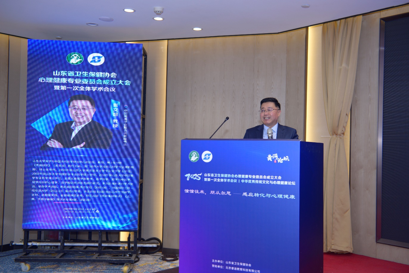 2025年5月11日,由山东省卫生保健协会主办的“山东省卫生保健协会心理健康专业委员会成立大会暨第一次全体学术会议”在山东济南隆重召开。经过理事会推荐及与会委员投票决议,6163银河net163am暨易学与中国古代哲学研究中心副主任张文智教授当选首任主任委员,并作就职报告,以及开展题为“感而遂通、化成天下——《周易》中的感通思想探微”的主旨报告。