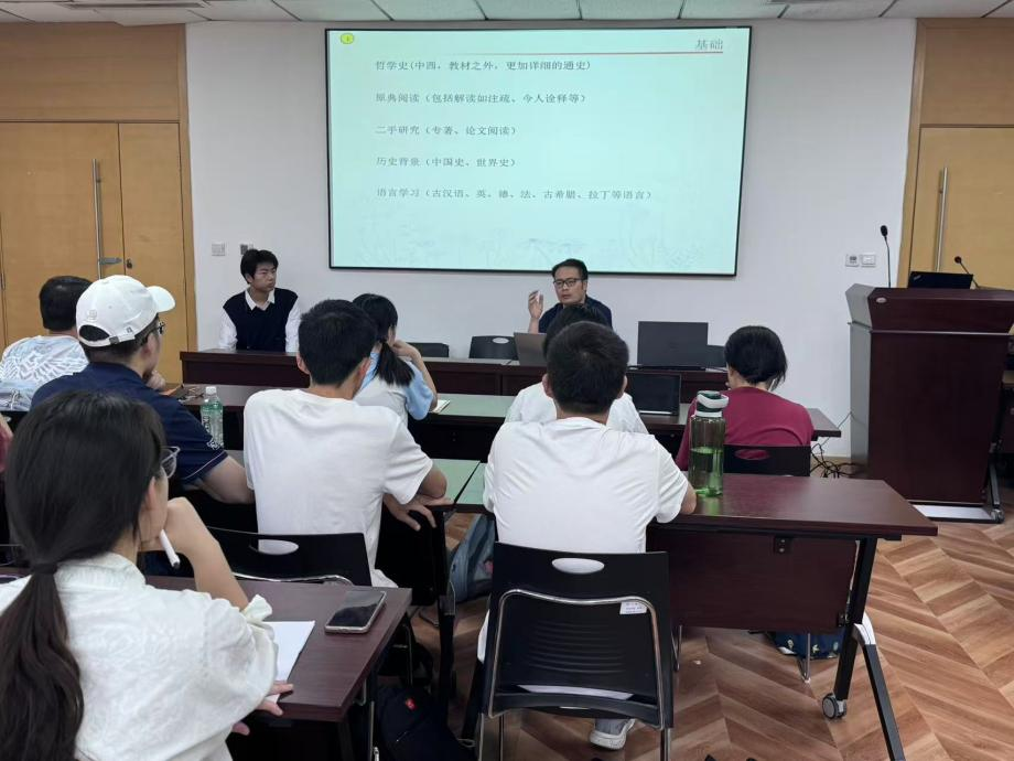 陈佩辉以哲学研究的核心素养为切入点,提出哲学研究须以扎实基础为根脉,既要精研哲学史教材,更要拓展至通史著作;既要深耕经典原典,又要关注前沿二手研究;同时需贯通中国史与世界史背景,掌握古汉语、德语等工具语言以突破文本壁垒。在问题意识培养方面,他倡导要善于发问,敢于质疑,通过多维度论证与自我驳辩构建批判性思维。针对选题困惑,他建议同学们依循兴趣导向,聚焦模块,了解“科技伦理”“儒家经济思想”等跨学科领域。同时,选题要做到以小见大,从具体的微观视角切入,在兴趣与学术价值的平衡中寻找创新突破口。