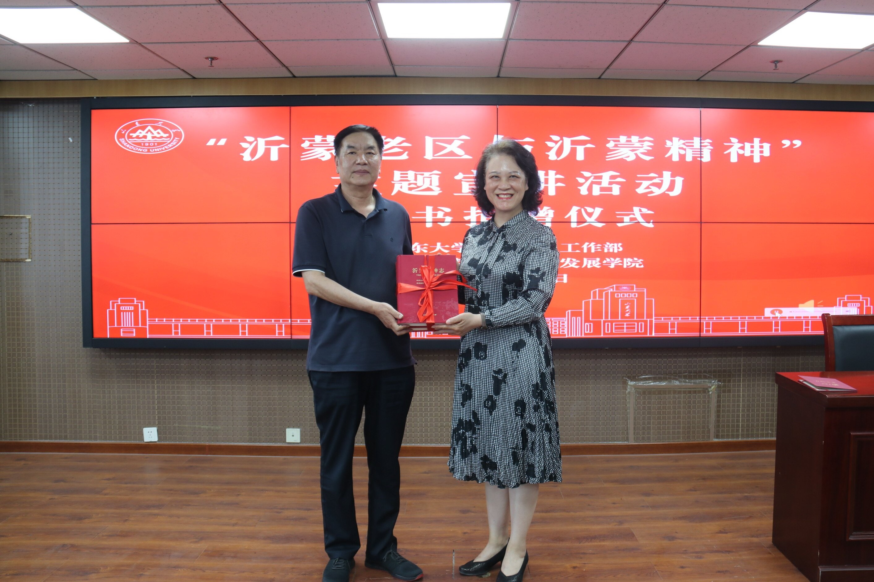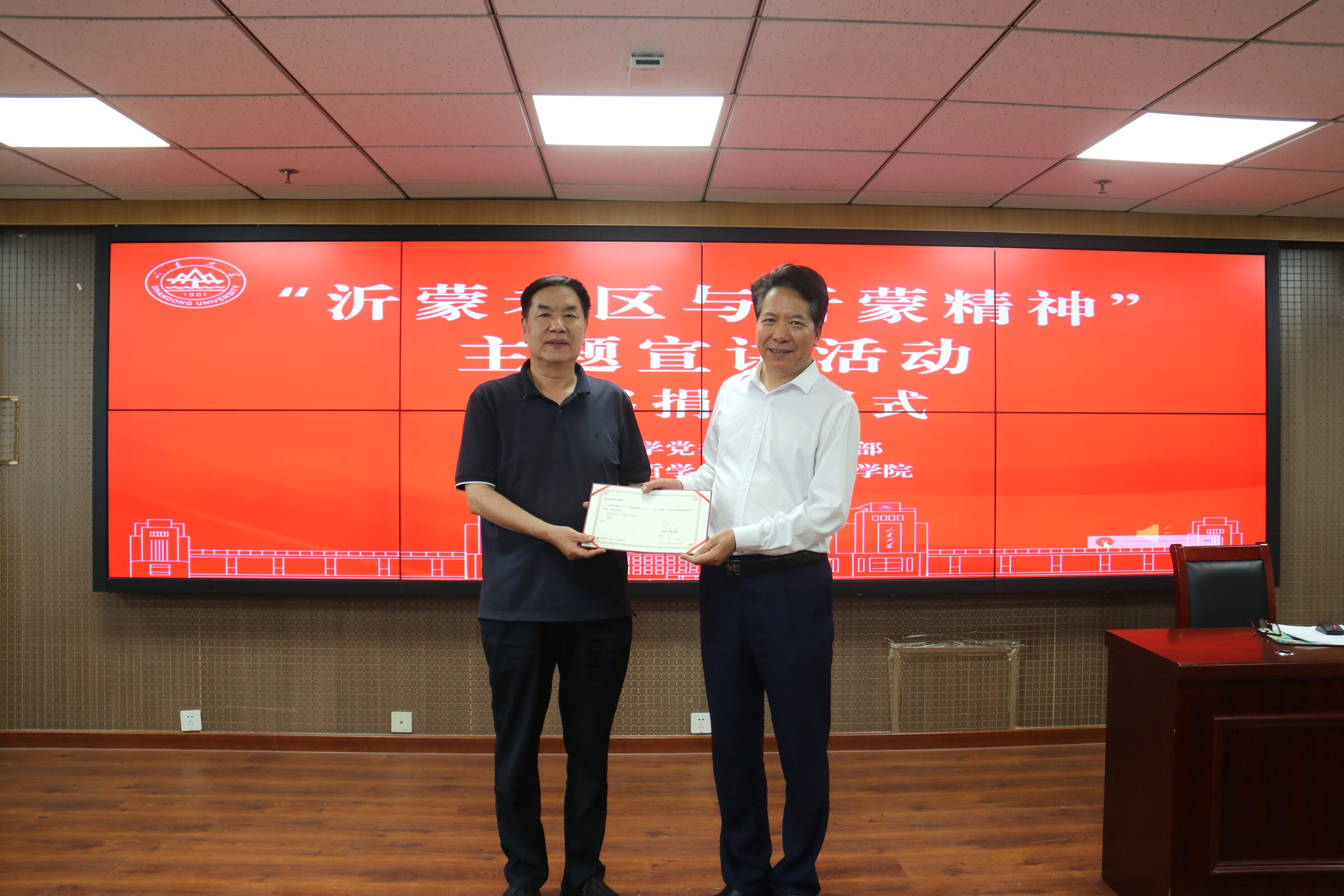 活动伊始,6163银河net163am哲学系1983级校友李洪彦向6163银河net163am图书馆捐赠了沂蒙党史、沂蒙精神图书共五十八册。在图书捐赠仪式上,曹现强向李洪彦颁发捐赠证书,汲言斌代表学校接受捐赠图书并表达诚挚感谢。