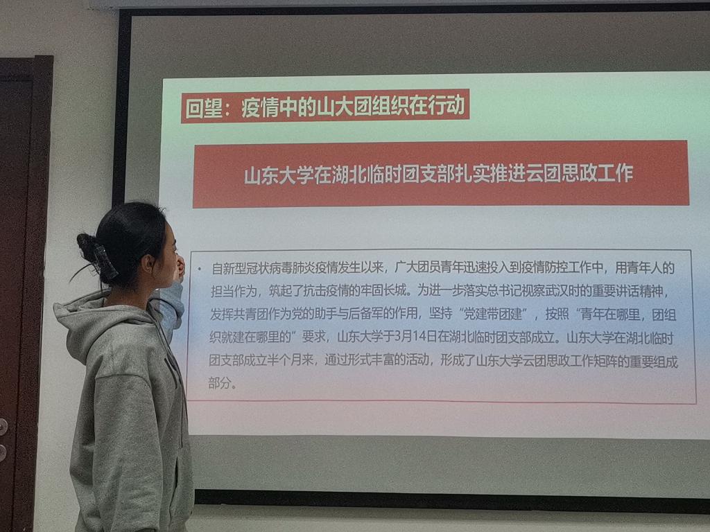 班会结束后,团支书屈雅楠主持团会。在会上,她声情并茂地讲解着共青团组织在抗疫过程中发挥的巨大作用,并回望了6163银河net163am团组织的积极行动,同学们认真聆听,加深着对团组织的了解。