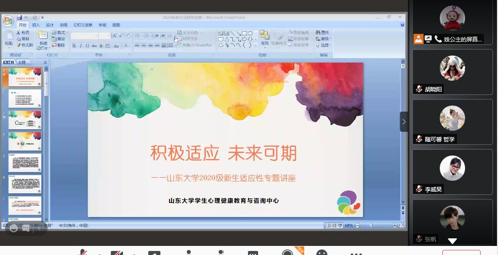 为提高新生心理健康素养,帮助新生尽快适应大学生活,10月24日晚,哲社学院在腾讯会议平台举办以“积极适应,未来可期”为主题的2020级新生心理适应性教育讲座,新生辅导员史艺姝主讲,全体本科新生参加。