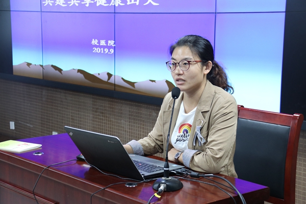 张雅楠以“做好校园疾病预防,共建共享健康山大”为主题,为新生们做了校园安全和健康指导以及校园传染病知识的普及。她首先从“安全”和“健康”两个角度展开,提出了“四大基石”“四个最好”和“安全健康十点建议”等概念,呼吁新生们坚持健康的生活方式,度过有意义的大学生活。接着又进行了传染病的介绍,主要围绕传染病的内容、预防、筛查和治疗等内容,以常见的结核病,艾滋病和甲乙型肝炎为例,以提问题的形式互动回答,给新生们上了生动的一课。除此之外,张医生还详细讲解了医保政策、校内外就医的注意事项和缴费程序,增进新生对校内外就医各项规定的了解。